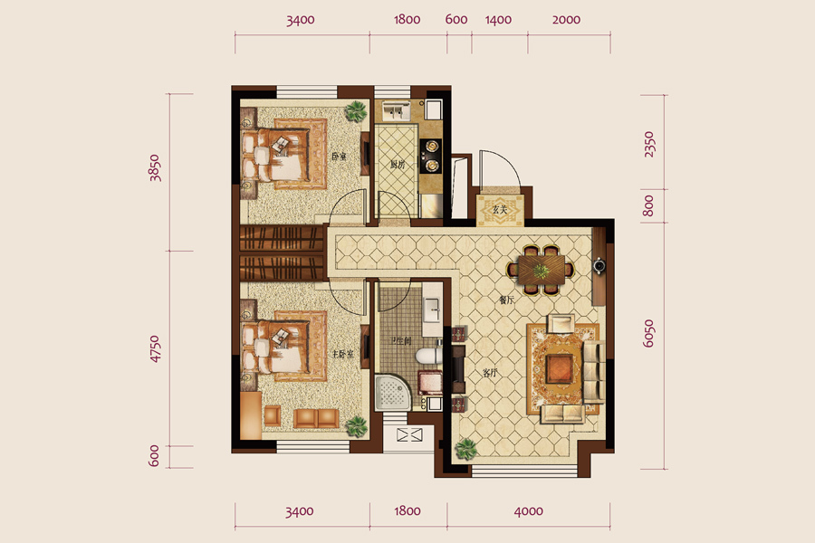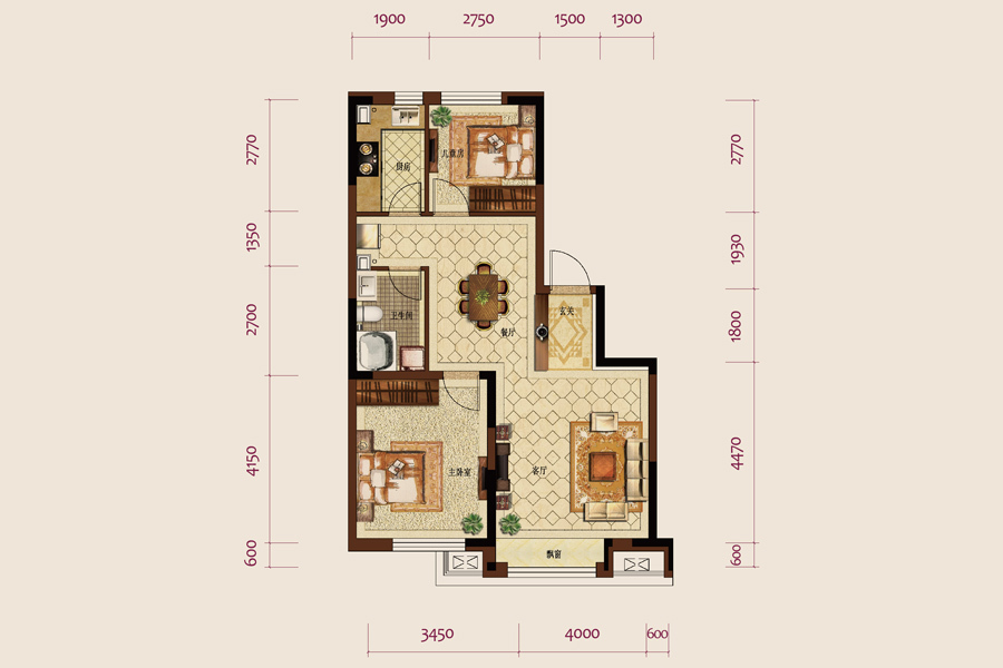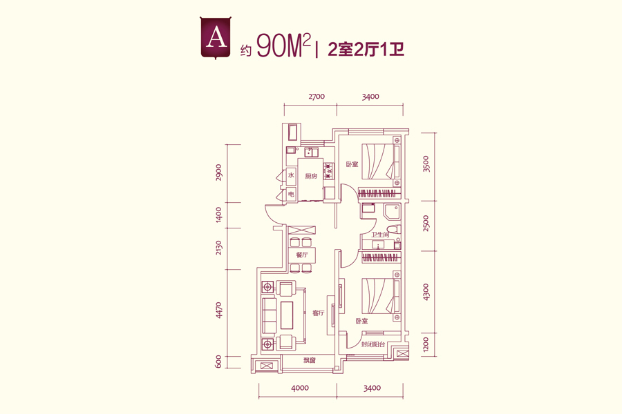 各个空间户型方正,方便室内家具布置;卫生间没有对外窗户;从卧室进卫生间需要穿过餐厅或客厅;卧室门朝向餐厅,外人可以一目了然的看到卧室,私密性较差。次卧的面宽进深比不在标准范围内,要适当缩放家具比例,让空间看起来更开阔;