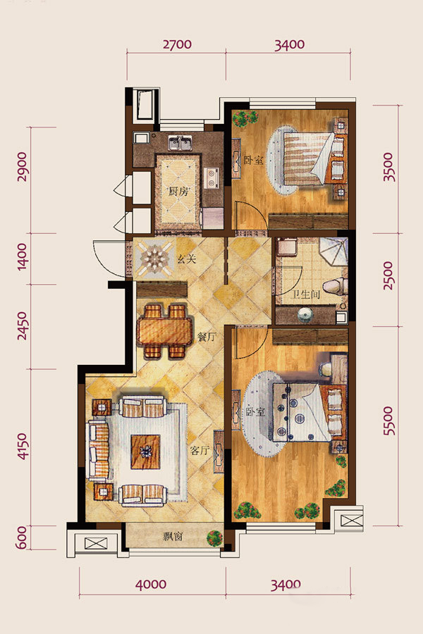 整体户型方正,活动区域开阔,居住舒适度高;卫生间如没有窗子,可加管道通风,但是相对来说卫生间有窗户是好的情况,利于排湿,不会使湿气进到室内。比较重要的空间无对外窗户,室内采光和通风欠佳;入户门进厨房需要穿过客厅;厨房门对着客厅,室内通风好,则无需顾虑油烟的困扰;客厅、卧室、卫生间和厨房等主要功能间的
