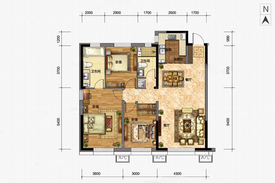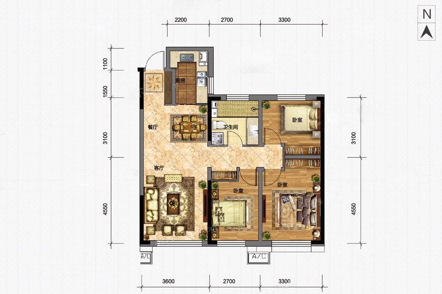 各个空间户型方正,方便室内家具布置;整个空间全明通透,采光良好,同时利于居住空间通风;整个户型空间布局合理,做到了干湿分离、动静分离,方便后期生活;客厅、卧室、卫生间和厨房等主要功能间的尺寸以及比例适中,有利于采光和通风,居住起来舒适、方便;