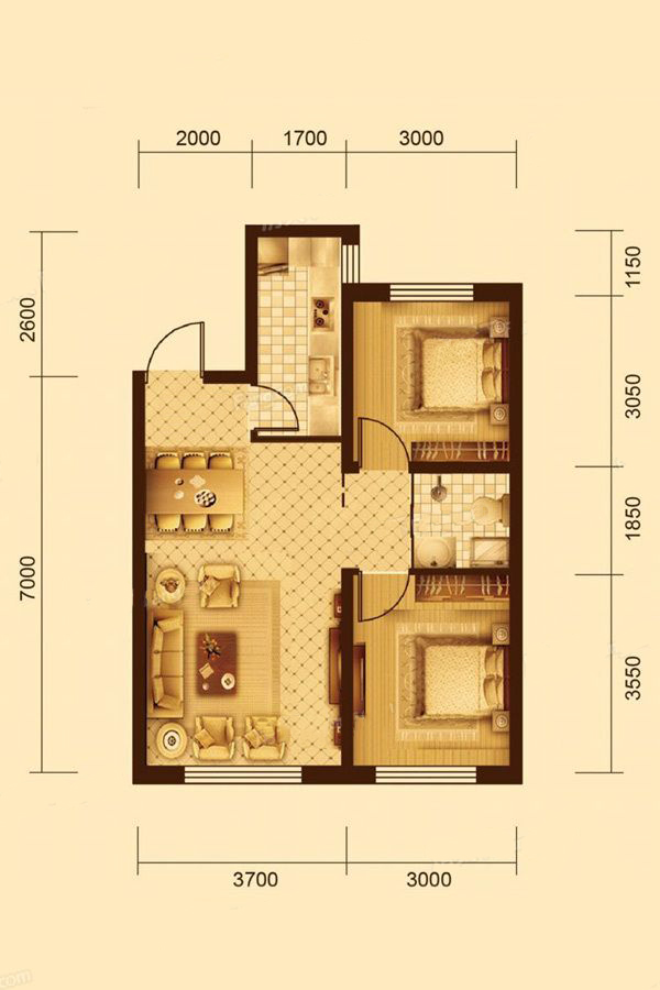 各个空间户型方正,方便室内家具布置;户型不是南北通透,后期装修时可以考虑加装纱门改善通风;卫生间没有对外窗户;入户门进厨房需要穿过客厅;卧室进卫生间需要穿过餐厅或客厅;卧室门朝向客厅或餐厅;厨房门对着客厅,室内通风好,则无需顾虑油烟的困扰;客厅、卧室、卫生间和厨房等主要功能间的尺寸以及比例适中,有利