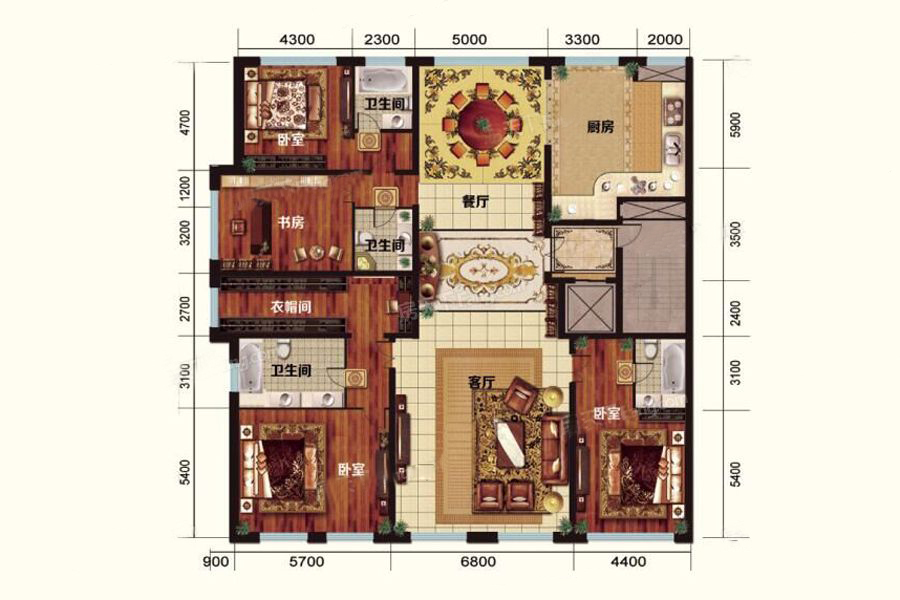 各个空间户型方正,方便室内家具布置;卫生间没有对外窗户;整体空间布局合理,能够保证动静分离和居室通风,方便使用;各个功能区的尺寸比例规范,布局合理,能很好地满足日常功能需求,整体空间开阔,采光充足,居住舒适度好;