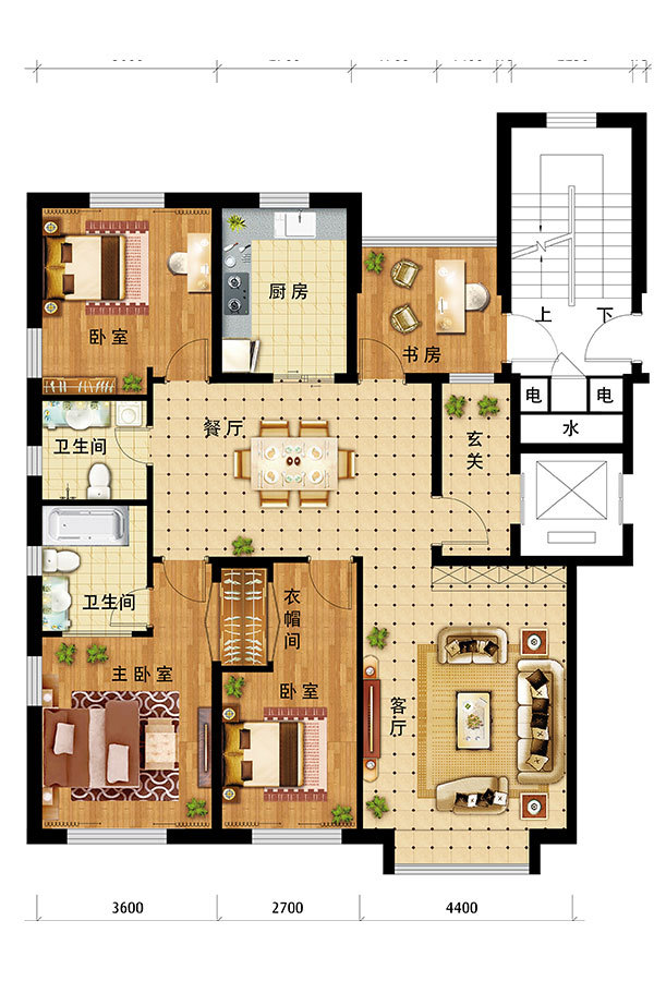 各个空间户型方正,后期空间利用率高;卫生间没有对外窗户,可通过加装排风机改善通风除湿;整体空间布局合理,能够保证动静分离和居室通风,方便使用;各个功能区的尺寸比例规范,布局合理,能很好地满足日常功能需求,整体空间开阔,采光充足,居住舒适度好;