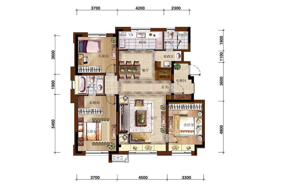 各个空间户型方正,方便室内家具布置;卫生间没有对外窗户,可通过加装排风机改善通风除湿;整体空间布局合理,能够保证动静分离和居室通风,方便使用;卧室厨卫等各个功能区的面积大小都比较合理,居住体验便利,整体舒适度高;