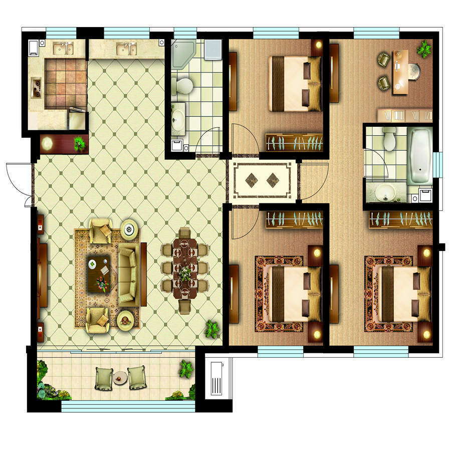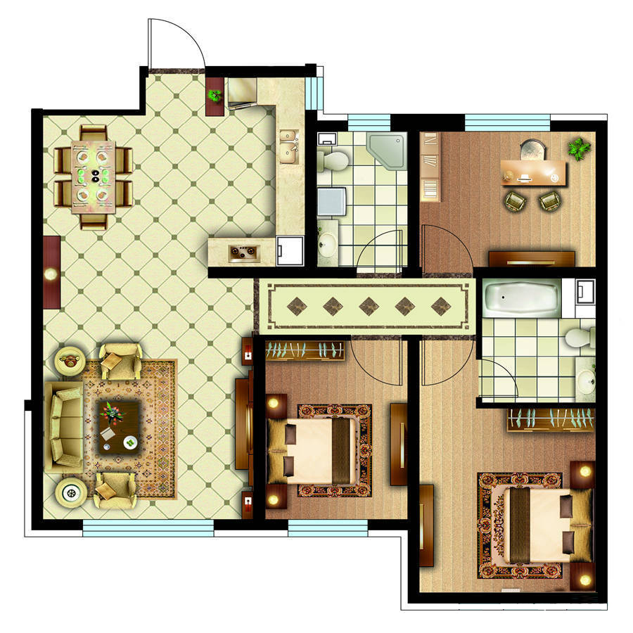 各个空间户型方正,方便室内家具布置;全明通透户型,居住舒适度较高,整个空间采光充足,利于后期居住;从次卧去卫生间要传堂入室,整个动线有点长,使用起来不方便。客厅、卧室、卫生间和厨房等主要功能间尺寸以及比例合适,方便采光、通风,后期居住方便