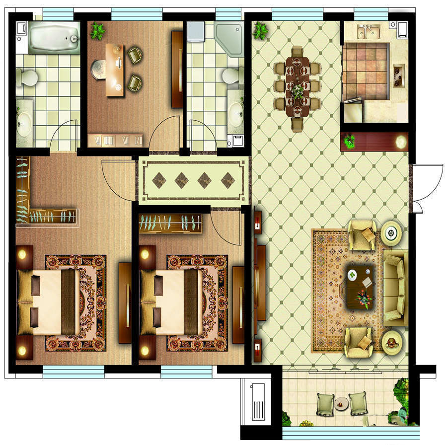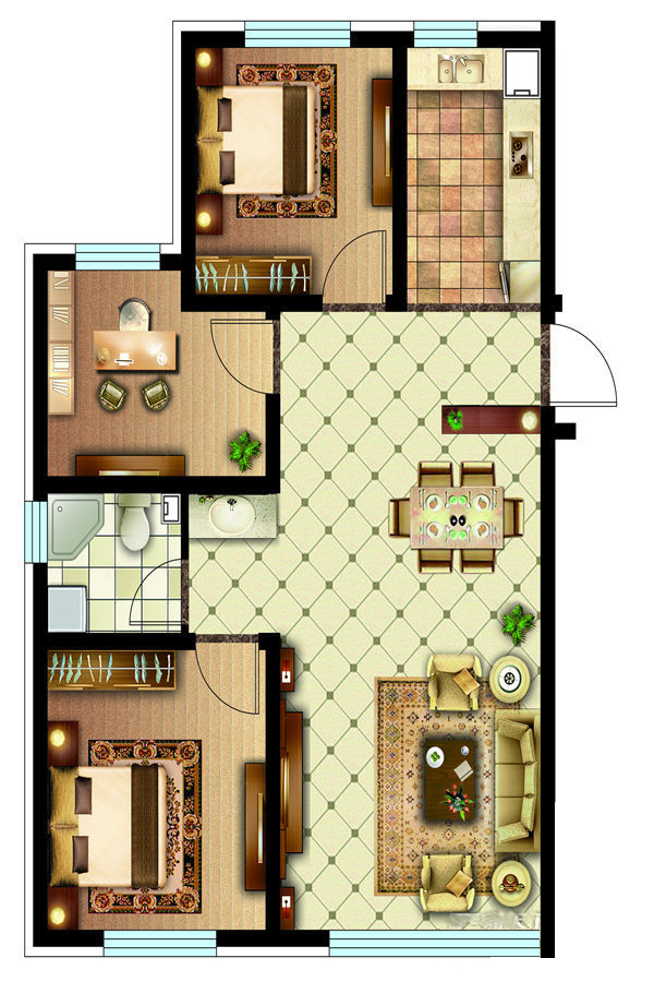各个空间户型方正,方便室内家具布置;其中一个卫生间没有窗子,可加管道通风,但是相对来说卫生间有窗户是好的情况,利于排湿,不会使湿气进到室内。整体空间布局合理,能够保证动静分离和居室通风,方便使用;客厅、卧室、卫生间和厨房等主要功能间的尺寸以及比例适中,有利于采光和通风,居住起来舒适、方便;