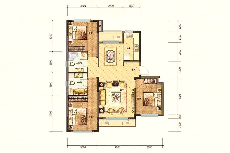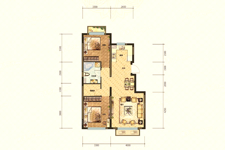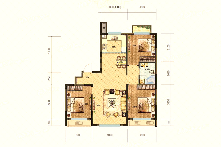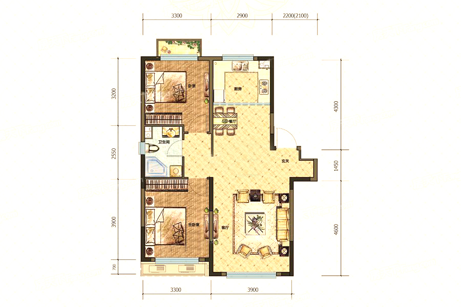 各个空间户型方正,方便室内家具布置;卫生间没有对外窗户,可通过加装排风机改善通风除湿;居室布局合理,通风良好,动静分离,兼顾到了卧室和卫生间的私密性;客厅、卧室、卫生间和厨房等主要功能间的尺寸以及比例适中,有利于采光和通风,居住起来舒适、方便。